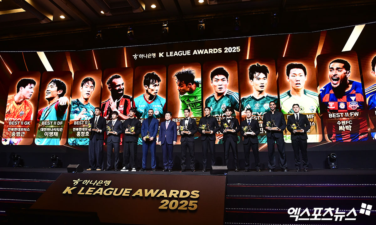 시상식 진행에 앞서 2025시즌 K리그1, 2에서 포지션별로 가장 뛰어난 활약을 펼친 22명의 선수들이 공개됐다. 10번째 K리그1 우승(라데시마)을 달성한 전북 현대와 K리그2 우승을 차지하며 한 시즌 만에 승격에 성공한 인천 유나이티드 선수들이 베스트 일레븐을 휩쓸었다.