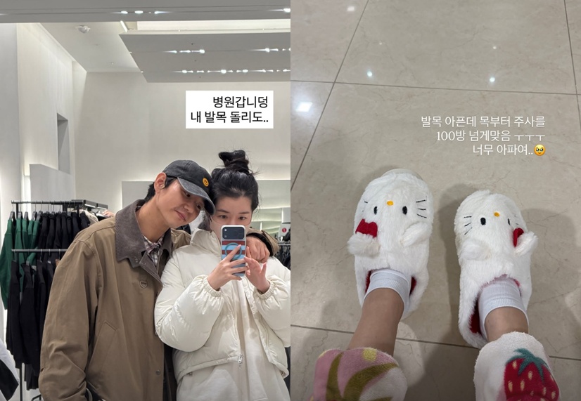 이어 그는 귀여운 키티 슬리퍼를 신은 사진을 올리면서 "발목 아픈데 목부터 주사를 100방 넘게 맞음 ㅠㅠ 너무 아파요"라고 토로하며 치료 상황을 전했다.