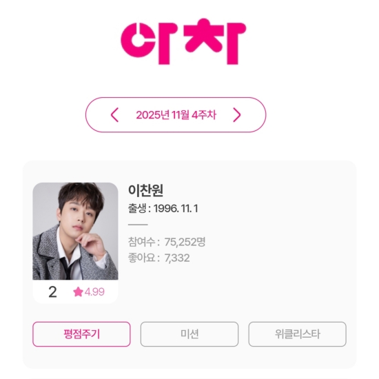 최근 아이돌차트에 따르면, 이찬원은 11월 7주 차 평점랭킹에서 2위를 차지했다.