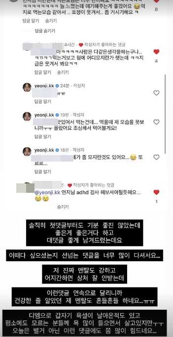 이에 김연지는 "맛있어서 먹는 건데.. 먹을 때 제 모습을 못 보니까 몰랐어요. 조심해서 먹어볼게요!", "제가 좀 모지란 것도 있어요. 또르르"라며 유쾌하게 악플을 넘기고자 했다. 그러나 또다른 누리꾼은 "연지님 adhd 검사 해보셔야 될 듯 해요.."라며 거들어 눈살을 찌푸리게 했다.