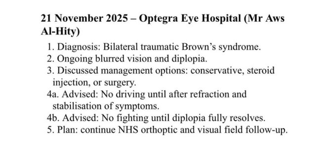 그는 자신의 인스타그램을 통해 의료 보고서를 직접 공개했다. 그가 전한 의료 보고서에는 "양안의 중대한 안구 외상"이라는 표현이 명시돼 있으며, 지속적인 복시(이중 시야), 안와 연부조직 손상, 우측 안와 내벽의 '경미한 골절' 등이 확인됐다.
