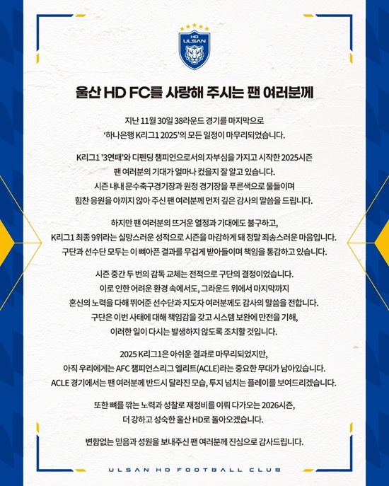 울산은 "지난 11월 30일 38라운드 경기를 마지막으로 하나은행 K리그1 2025의 모든 일정이 마무리됐다"면서 "K리그1 3연패와 디펜딩 챔피언스로서의 자부심을 가지고 시작한 2025시즌 팬 여러분의 기대가 얼마나 컸을지 잘 알고 있다. 시즌 내내 문수축구경기장과 원정 경기장을 푸른색으로 물들이며 힘찬 응원을 아끼지 않아 주신 팬 여러분께 먼저 깊은 감사의 말씀을 드린다"고 전했다.