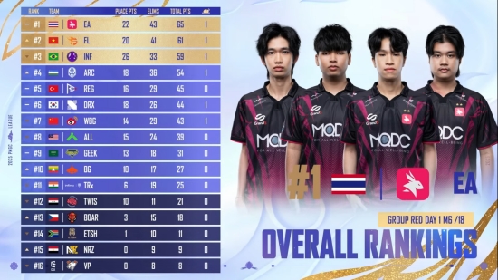 한국의 DRX가 속한 그룹스테이지 그룹 레드. 1일 차 경기를 치른 결과, EA가 1치킨, 65점으로 1위에 올랐다. 그리고 뒤를 이어 FL이 61점으로 2위, INF가 59점으로 3위를 차지했다. 이들 3팀은 3일 차까지 지금 순위를 지키면 파이널에 직행하게 된다.