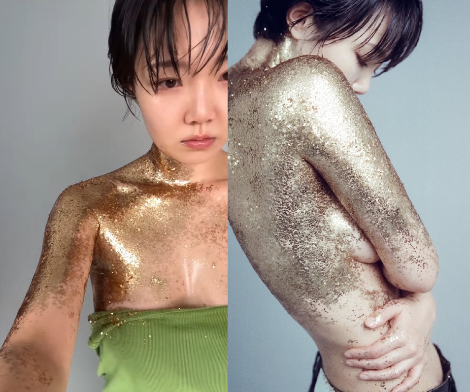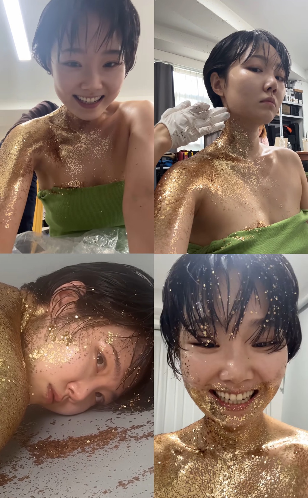 팔부터 시작해 목과 쇄골을 모두 금가루로 덮은 손수아는 금가루를 묻히고 포즈를 취하기 시작해 감탄을 자아낸다.
