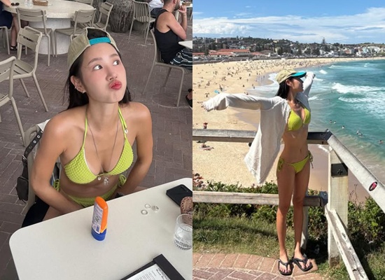 공개된 사진에는 해외 여행을 떠난 소유가 해변가에서 연두색 비키니를 입고 잔디밭에 앉아 휴가를 만끽하고 있는 모습이 담겼다.