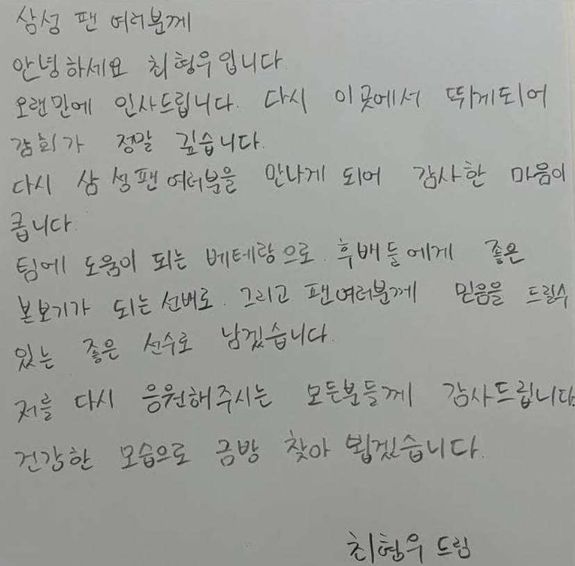 한편, 최형우는 같은 SNS를 통해 삼성 팬들에게도 역시 손편지로 인사했다.