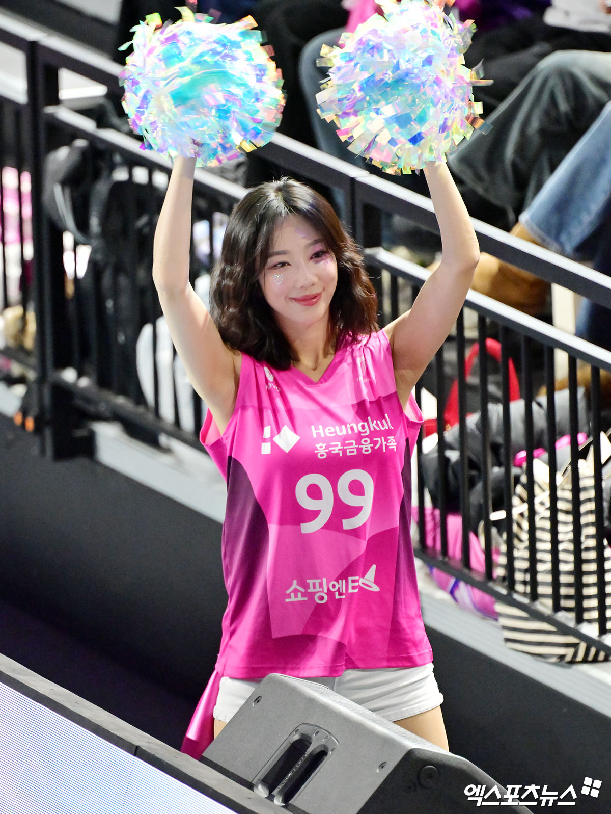(엑스포츠뉴스 인천, 김한준 기자) 3일 오후 인천 부평구 삼산월드체육관 열린 '진에어 2025-2026 V-리그' 흥국생명과 한국도로공사의 경기, 흥국생명 이미래 치어리더가 열띤 응원을 선보이고 있다.