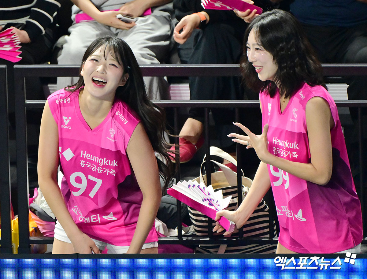 (엑스포츠뉴스 인천, 김한준 기자) 3일 오후 인천 부평구 삼산월드체육관 열린 '진에어 2025-2026 V-리그' 흥국생명과 한국도로공사의 경기, 흥국생명 최석화 이미래 치어리더가 미소를 보이고 있다.