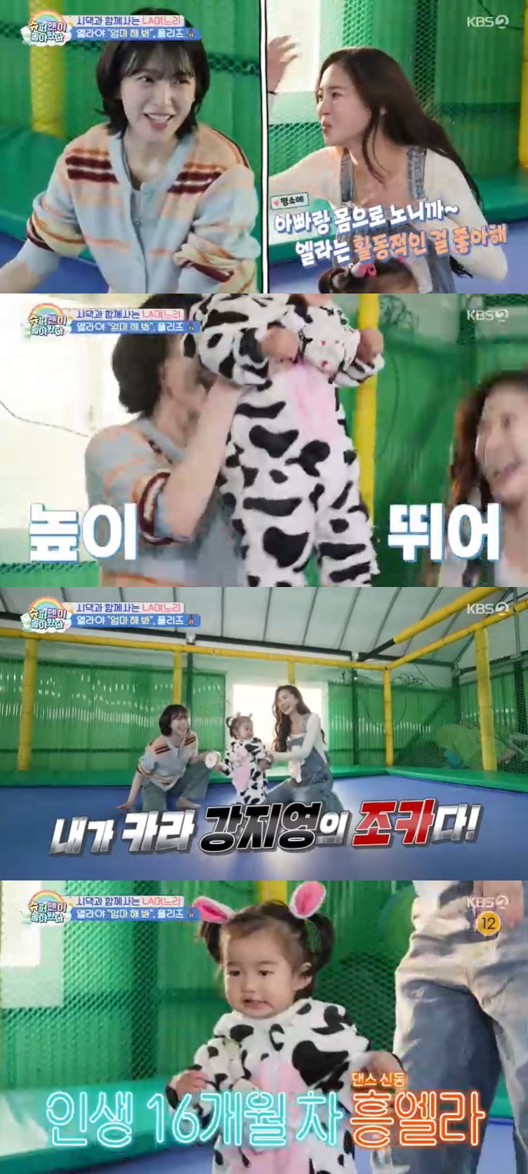 또 강지영은 카라의 대표곡 '미스터'를 부르며 춤을 춰 엘라의 흥을 폭발하게 했다. 엘라는 '흥 부자' 면모를 보여주며 열심히 뛰고 춤을 췄다. 김윤지는 "저희가 흥이 많은 가족인데, 역시 엘라도 '흥 부자'구나"라며 "너무 재밌었다"라고 전했다.