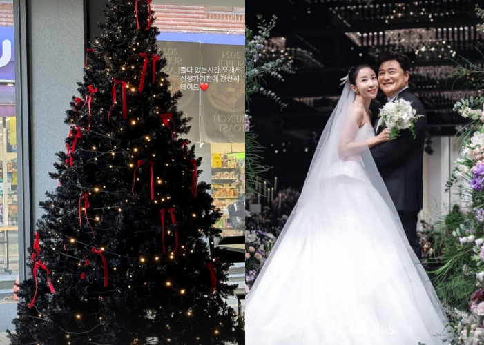 사진 속 원진서는 윤정수와 감성 가득한 크리스마스 트리가 있는 카페에서 시간을 보내고 있다.