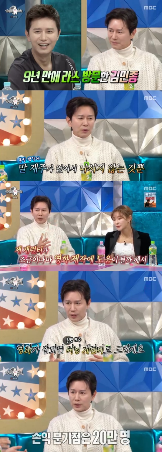 김민종은 "손익분기점이 20만 명이다. 제가 러닝 개런티를 받을 수 있게 '라디오스타'가 좀 도와달라"고 진심으로 얘기해 웃음을 줬다.