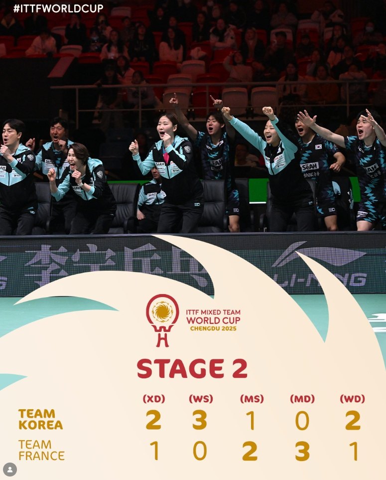 (엑스포츠뉴스 권동환 기자) 한국 탁구가 2025 국제탁구연맹(ITTF) 혼성단체 월드컵 2스테이지에서 프랑스를 꺾으며 4연승을 달렸다.