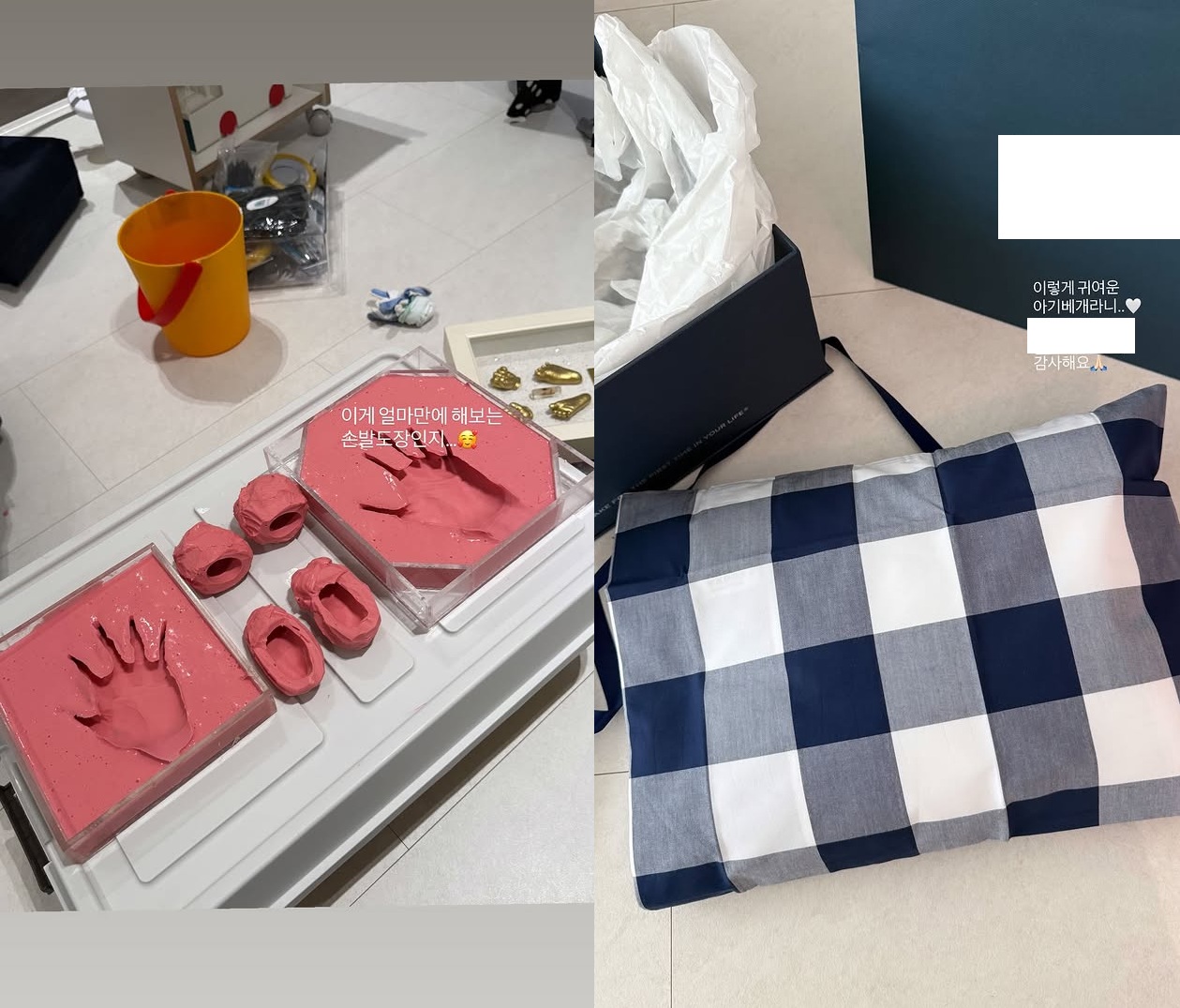 공개된 사진 속에는 둘째 딸의 탄생을 기념해 손과 발 모형 제작에 필요한 본 뜬 석고가 있어 눈길을 끈다.