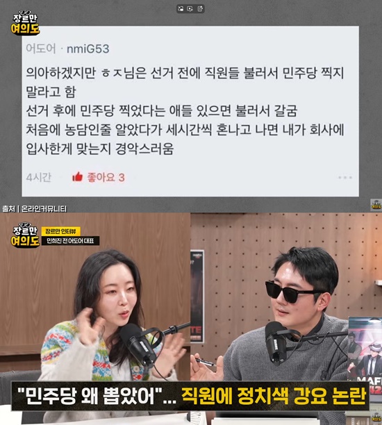 또한 블라인드에 올라온 민주당을 찍은 직원을 3시간 동안 혼냈다는 글에 대해 "그때는 코로나여서 출근도 안 하는 시점이다. 근데 불러서 3시간 동안 혼냈다는 게 말도 안 된다. 블라인드에는 뜬소문도 많다 그걸 증거로 제시하는 게 말이 안 된다"고 선을 그었다.