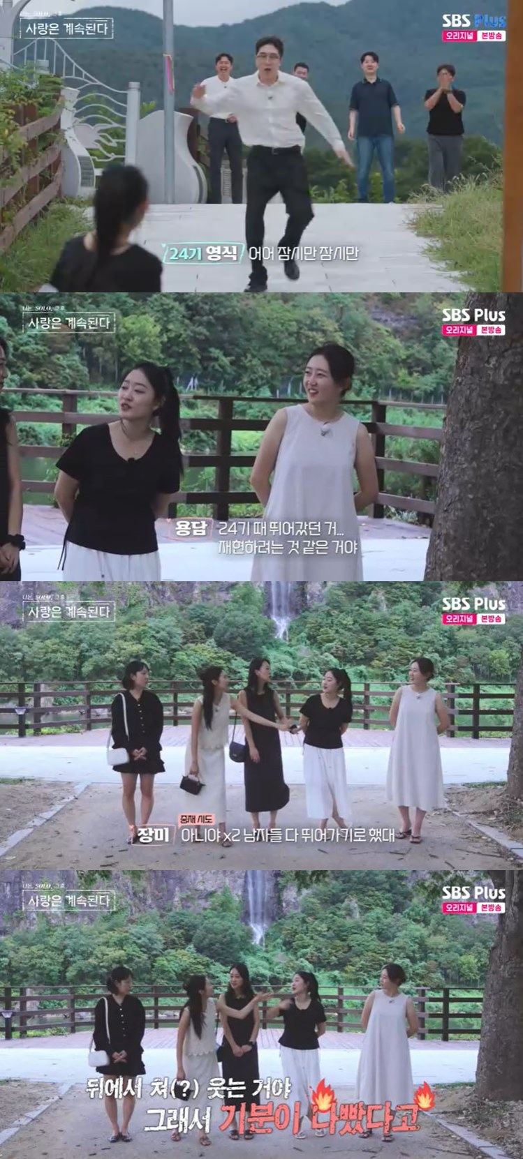 이후 여성 출연자들끼리 모이자, 용담은 "24기 때 뛰어갔던 거 재현하려고 하는 것 같은 거다. 그래서 기분 되게 나빴다"라고 솔직학게 털어놨다. 이에 장미가 "아니다. 남자들 다 뛰어가기로 했다더라. 나 때도 뛰어왔다"라며 오해를 풀어주려 노력했다.