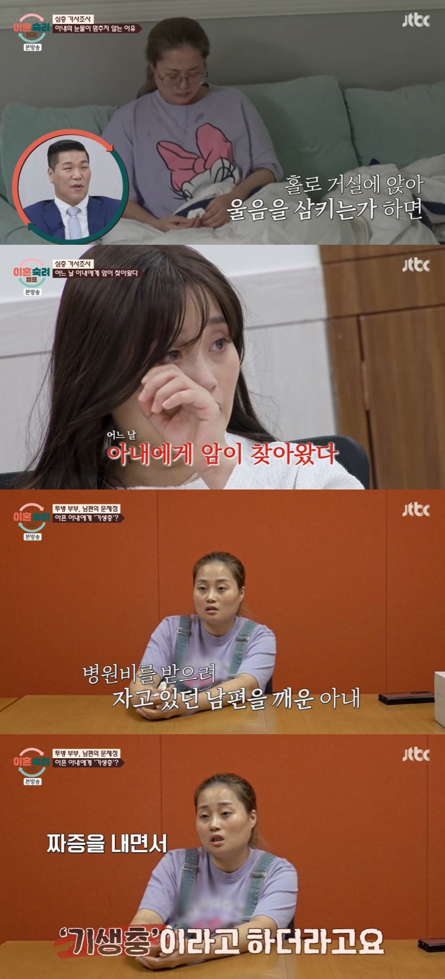 남편은 아내가 암인 걸 알게 됐음에도 치료 비용을 더 걱정하는 모습을 보였다. 아내는 인터뷰에서 "수술비는 보험이 돼서 덜 나오는데, 항암 치료는 돈이 많이 나온다고 얘기했더니 항암 치료 안 하고 수술만 하면 안 되겠냐고 하더라. 돈 때문에 그렇게 말한 것 같다"라고 말해 충격을 줬다. 또 병원비를 달라는 아내에게 짜증을 내면서 '기생충'이라고 하기도 했다고.