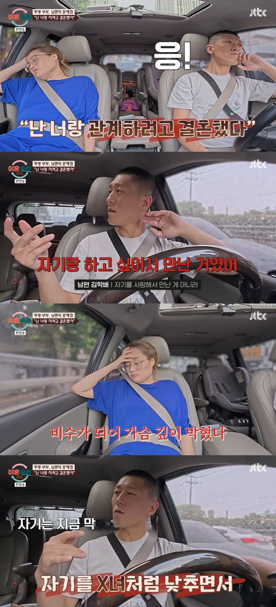 이어 아내는 남편에게 "오빠 나한테 그런 얘기 많이 했지 않냐. '난 너랑 XX하려고 결혼했다'고"라고 말했다. 이에 남편은 인정하면서 "난 자기를 사랑해서 만난 게 아니라, 자기랑 (관계를) 하고 싶어서 만난 거였다. 그러다 사랑하게 된 거고. 그래서 결혼한 거다. 자기는 지금 막 자기를 X녀처럼 낮추면서 내가 한 말을 왜곡하는 거다"라고 말해 모두를 분노하게 만들었다.