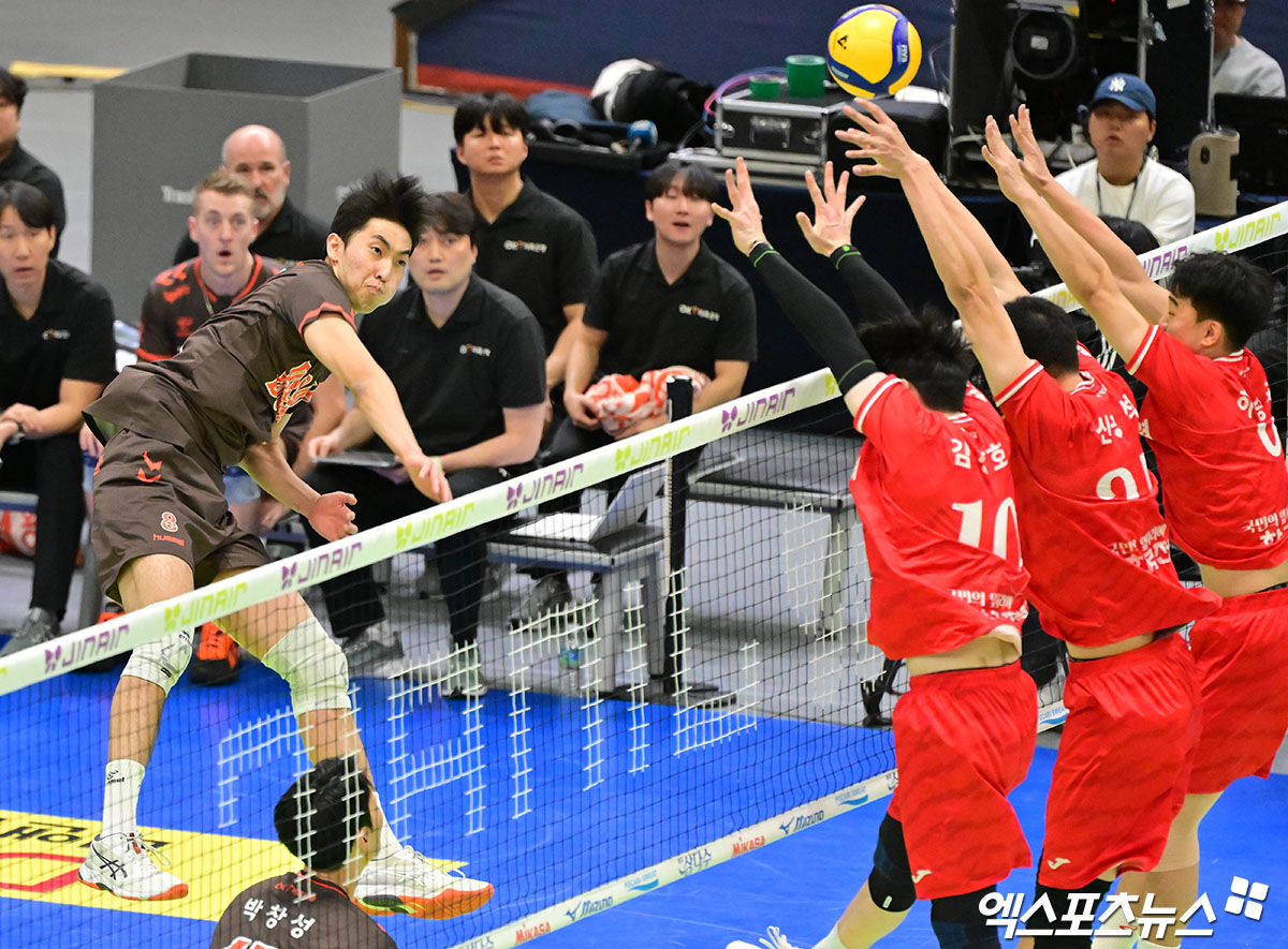 (엑스포츠뉴스 수원, 김한준 기자) 5일 오후 경기도 수원실내체육관에서 열린 '진에어 2025-2026 V-리그' 한국전력과 OK저축은행의 경기, OK저축은행 차지환이 공격을 시도하고 있다.