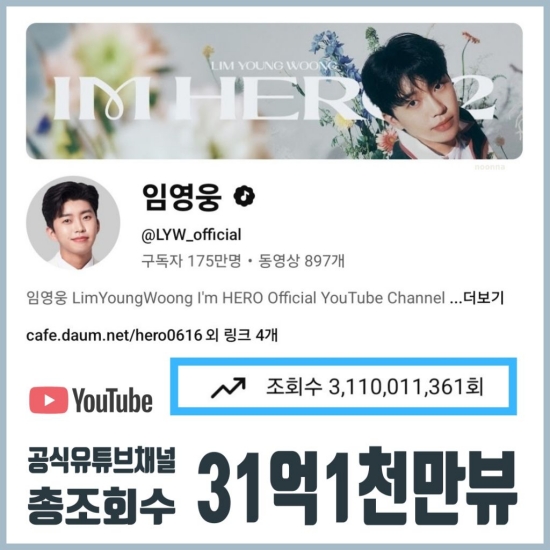 최근 임영웅의 공식 유튜브 채널인 '임영웅'은 총 조회수 31억 1천만 뷰를 돌파했다.