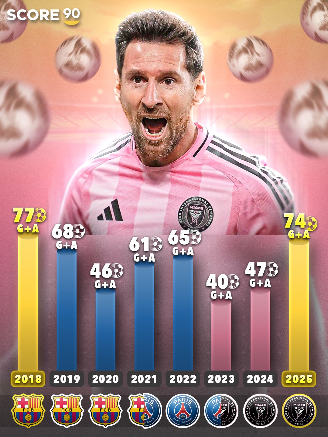 글로벌 축구 매체 '스코어90'에 따르면, 메시는 2018년 77개의 공격포인트 이후 가장 많은 기록을 세웠다.