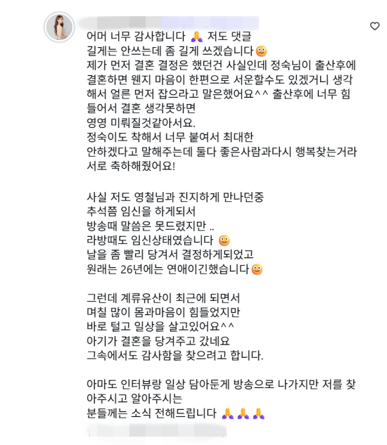 이어 "사실 저도 영철님과 진지하게 만나던 중 추석쯤 임신을 하게 되서 방송 때 말씀은 못 드렸지만 라방 때도 임신 상태였습니다. 날을 좀 빨리 당겨서 결정하게 됐고 원래는 26년에는 연애이긴 했습니다. 그런데 계류유산이 최근에 되면서 며칠 많이 몸과 마음이 힘들었지만 바로 털고 일상을 살고 있어요"라고 털어놨다.