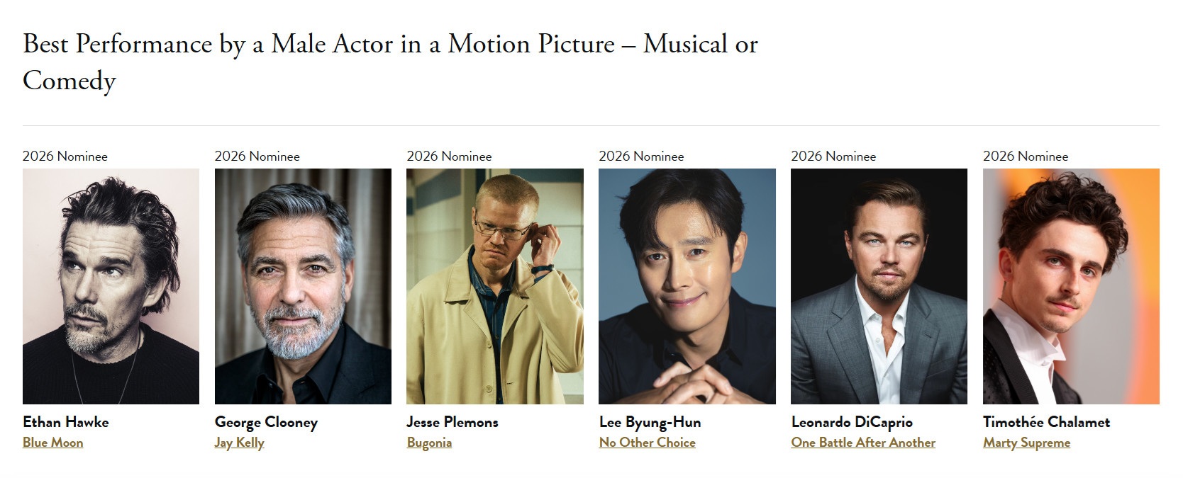특히, 남우주연상 후보로 오른 이병헌은 '원 배틀 애프터 어나더'의 레오나르도 디카프리오, '블루문'의 이단 호크, '제이 켈리'의 조지 클루니, '마티 슈프림' 티모시 샬라메 등 쟁쟁한 배우들과 경쟁하게 되어 눈길을 끈다.