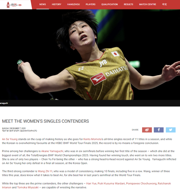 (엑스포츠뉴스 권동환 기자) 세계배드민턴연맹(BWF)이 2025 BWF 월드투어 파이널 각 종목 예고를 하면서 헤드라인으로 안세영이 아닌 야마구치 아카네(일본)를 꼽아 눈길을 끈다.