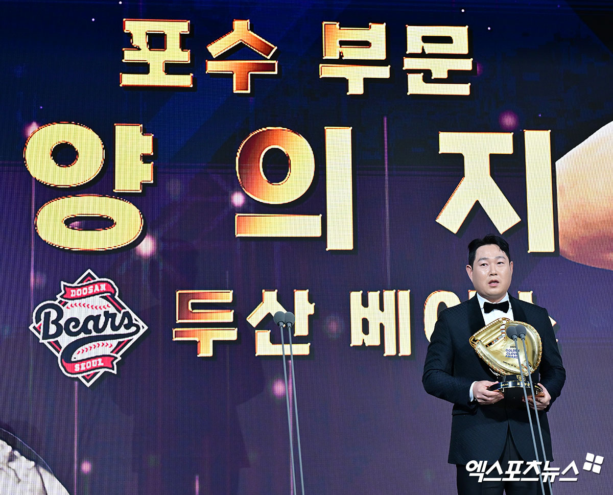 양의지는 지난 9일 서울 송파구 롯데호텔 월드 크리스탈 볼룸에서 열린 2025 KBO 골든글러브 시상식 포수 부문 골든글러브 수상자로 발표됐다. 총 316표 가운데 278표(88% 득표율)를 득표했다.