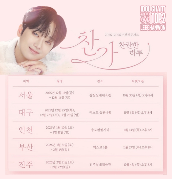 이찬원은 이번 주부터 전국투어를 이어간다. 그는 12월 12~14일 서울 잠실실내체육관에서 '찬가 : 찬란한 하루' 투어의 포문을 연다. 이후 그는 대구(12월 25일·27~28일), 인천(1월 10~11일), 부산(1월 31일~2월 1일), 진주(2월 21~22일)에서 공연을 이어간다.