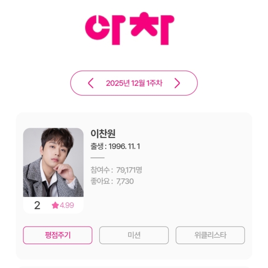 최근 아이돌차트에 따르면, 12월 1주 차 평점랭킹에서 이찬원이 2위를 차지했다.