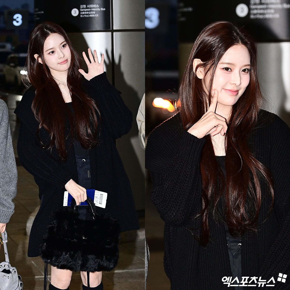 이날 방지민은 올 블랙 공항패션을 선보였다. 무릎까지 내려오는 블랙 컬러의 롱 카디건을 비롯해 이너와 하의 역시 블랙으로 맞춰 통일감 있고 세련된 무드를 연출했다.