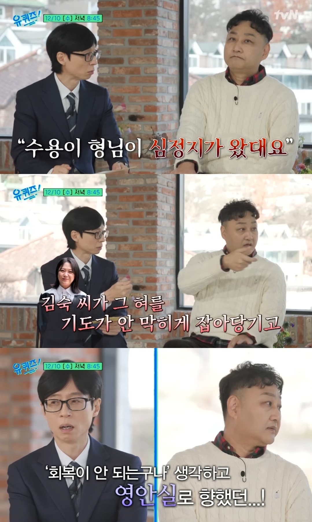 공개된 '유퀴즈' 예고편에서 김수용은 "제 혀가 막 말렸다더라. 김숙 씨가 기도 안 막히게 혀를 잡아당기고, 임형준 씨가 비상으로 갖고 있던 혈관 확장제를 제 입안에 밀어넣었다"며 아찔했던 당시 상황을 회상했다.