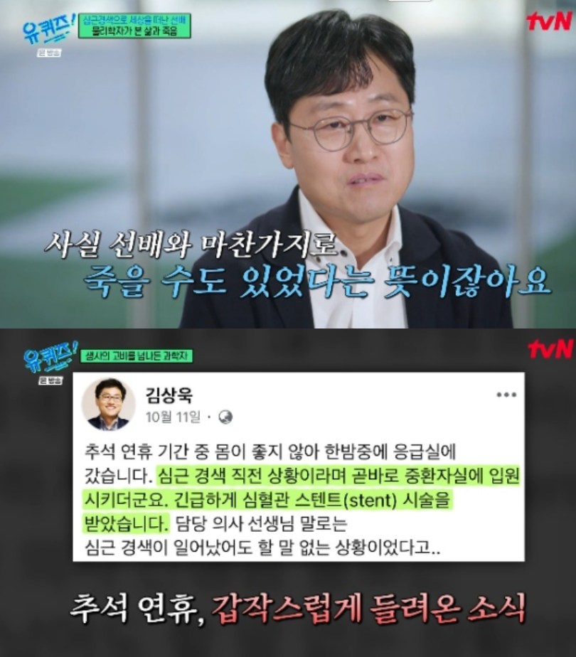 김수용에 앞서 지난달에는 물리학자 김상욱 교수가 심근경색 직전에서 회복해 '유퀴즈'에 출연했다.