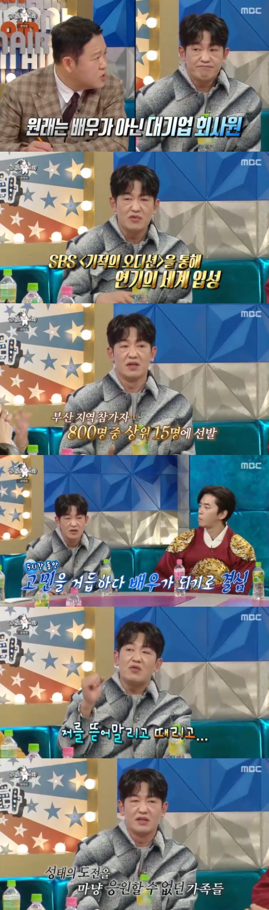 이날 방송에서 허성태는 평범한 회사원에서 뒤늦게 배우의 길을 걷게된 것에 대해 "제가 LG전자 해외 영업 담당을 했었다. 이후에 경력직으로 대우 조선으로 이직을 했다. 과장 진급 3개월을 앞두고 '기적의 오디션'에 참여하게 됐다"고 했다.