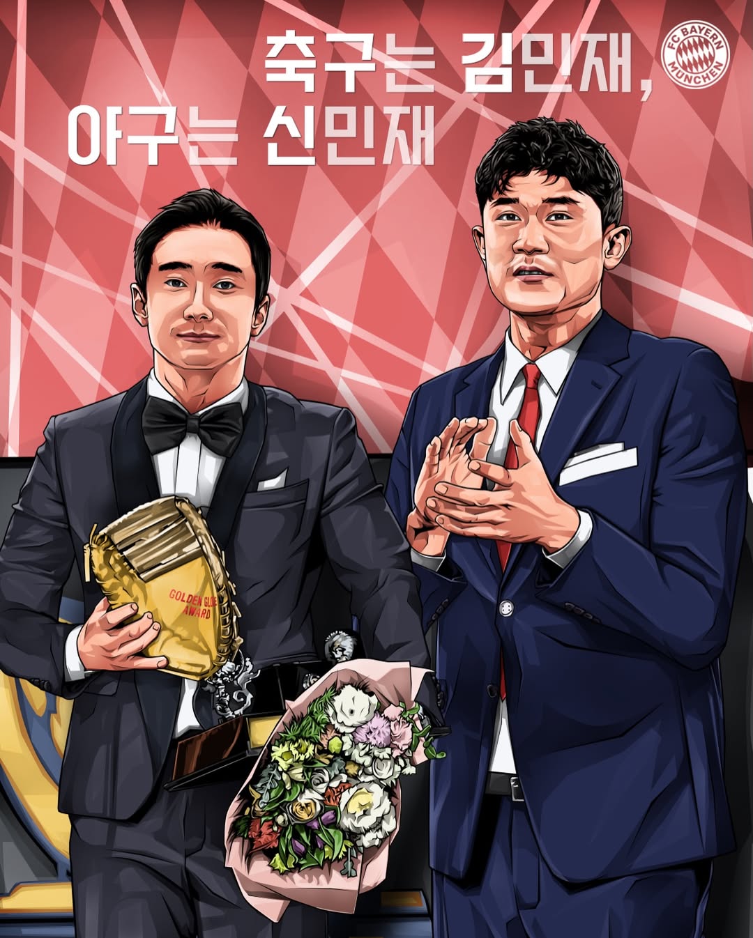 바이에른 뮌헨은 10일(한국시간) 구단 공식 소셜 미디어(SNS)를 통해 "신민재 선수의 골든글러브 수상을 축하합니다! from 김민재 구단 바이에른 뮌헨"이라는 글과 함께 한 장의 일러스트를 게시했다.
