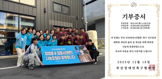 (엑스포츠뉴스 이정범 기자) '영웅시대밴드'가 연말을 맞아 부산뇌성마비축구팀(F.C 오뚜기)에 1,000만 원을 후원했다.