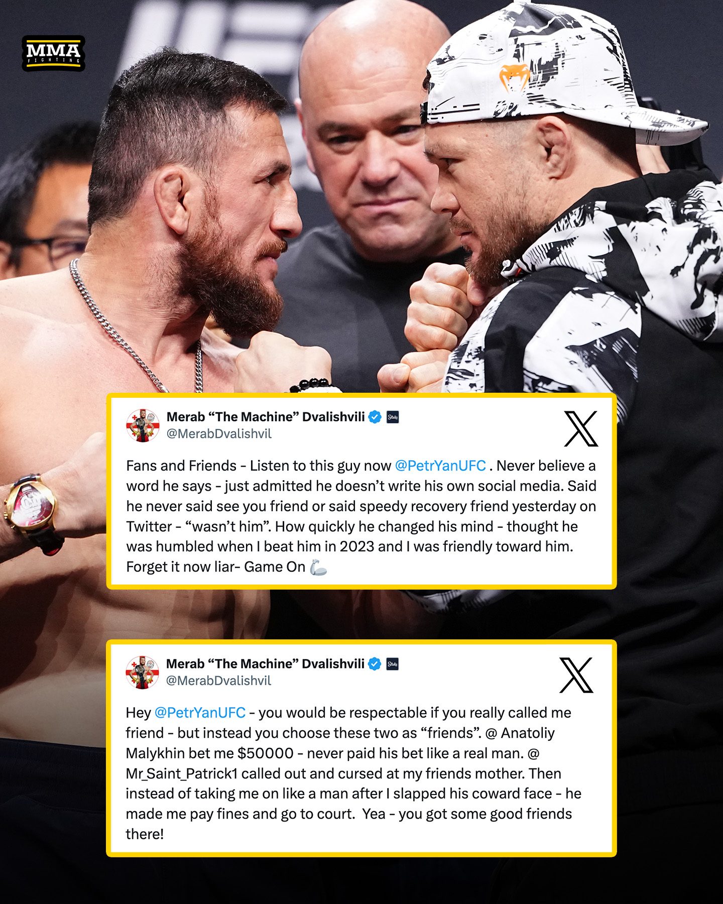 결국 드발리쉬빌리가 이에 즉각 대응했다. X(구 트위터)에 글을 올려 페트르 얀을 강하게 비판했다. 그는 "그 녀석의 팬들과 친구들, 지금 이 자식의 말을 들어보라. 그는 하는 말 한마디도 믿을 수 없다"며 분노를 표했다.