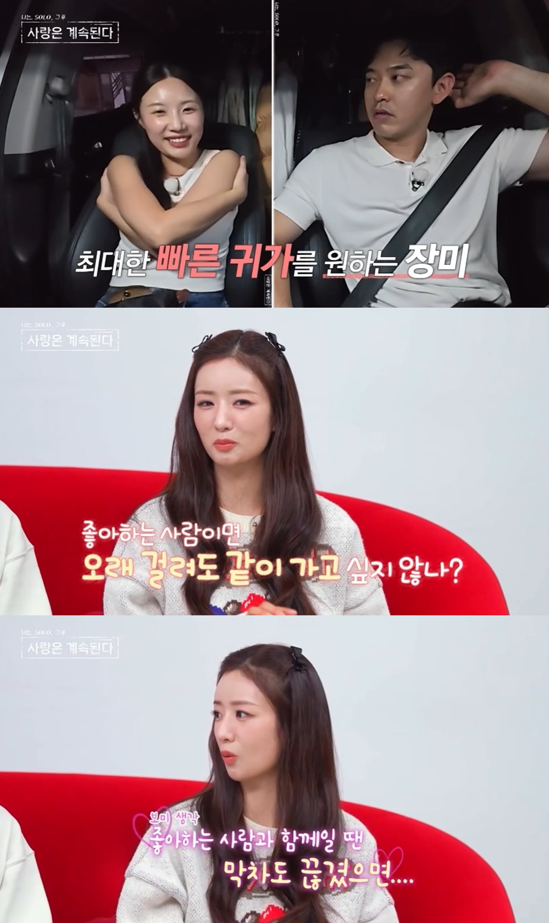 이 가운데 27기 영식은 "아니면 고속열차 역까지만 데려다주겠다"라고 제안했고, 머뭇거리던 장미는 "나는 사실 차 타고 이동하면 시간이 길어지는 것 때문에 빨리 가고 싶다"라고 말했다.