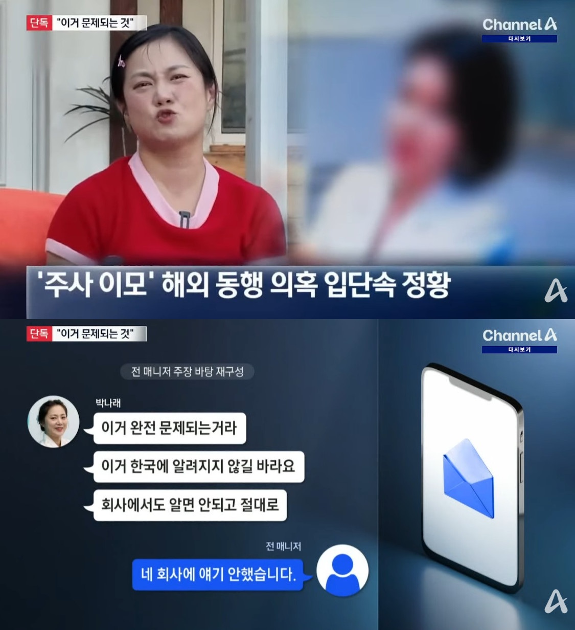 13일 채널A는 박나래 전 매니저의 추가 폭로를 공개했다. 불법 의료 시술 의혹을 받는 '주사 이모'를 해외 촬영에 몰래 데려갔을 때의 대화가 나온 것.