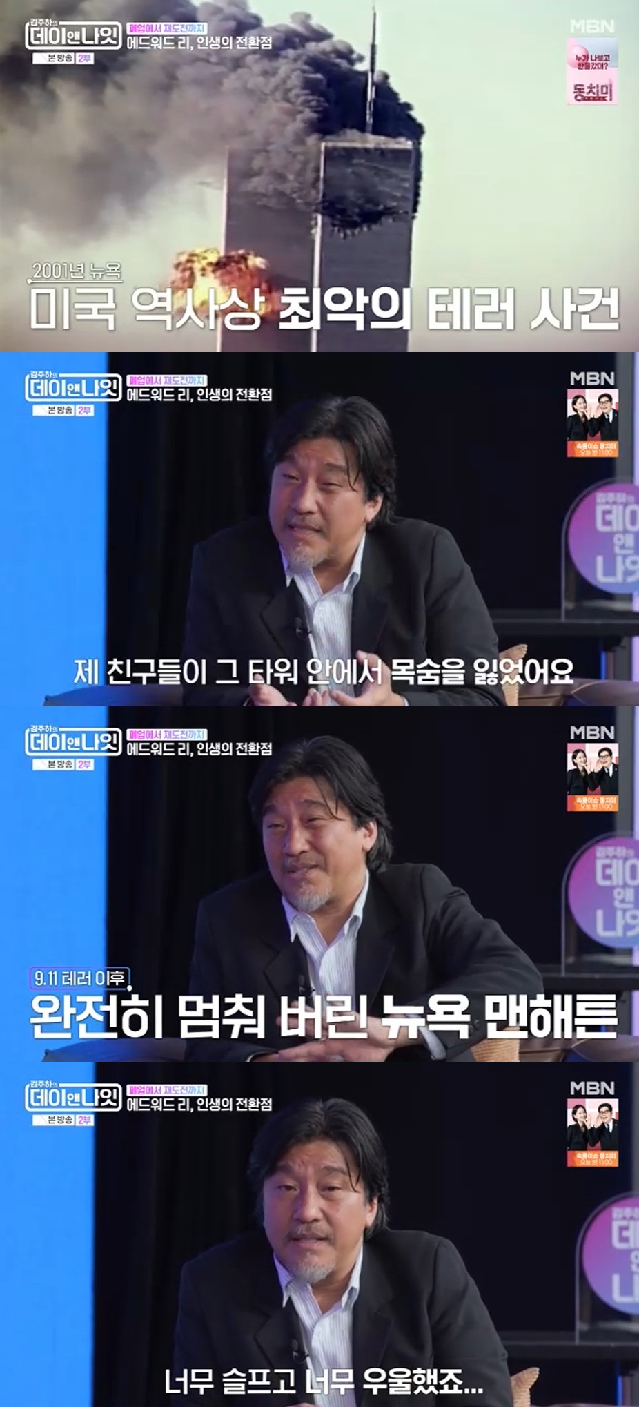 에드워드 리는 "그때 2001년 9.11테러가 발생했다. 미국 역사상 최악의 테러였던 사건을 언급한 에드워드 리는 "저에게 정말 큰 충격이다. 제 친구들이 그 타워에서 목숨을 잃었다. 뉴욕 맨해튼이 완전히 셧다운됐다"고 전했다.