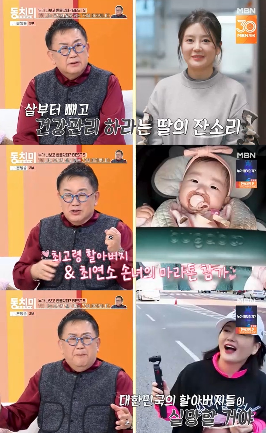 이날 이용식은 손녀딸 이엘이와의 도전을 언급했다. 73세의 나이에 마라토너가 됐다는 이용식은 "이엘이 입학식, 운동회에 같이 하고 중고등학교 입학도 보려면 살 빼고 관리하라고 하더라"라고 딸 이수민의 부추김을 이야기했다.