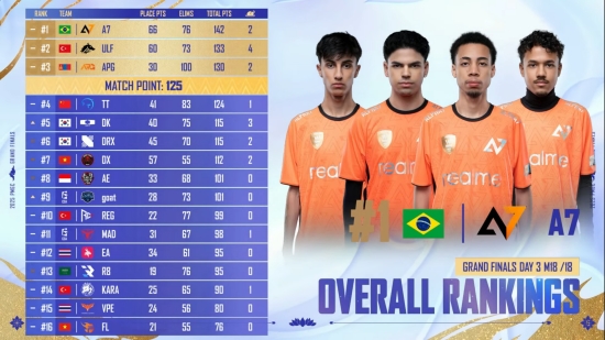 결국 3일 차 여섯 번째 경기이자 그랜드 파이널 18매치를 소화하게 된 16개 게임단. 경기를 치른 결과, A7이 그랜드 파이널 3일 도합 2치킨, 142점으로 챔피언에 등극했다.