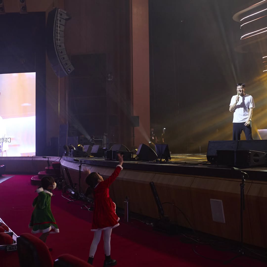 사진 속 박진영은 마이크를 잡고 무대에 섰지만, 시선은 산타 복장을 입고 있는 두 딸에게 고정하며 딸바보의 면모를 드러냈다.