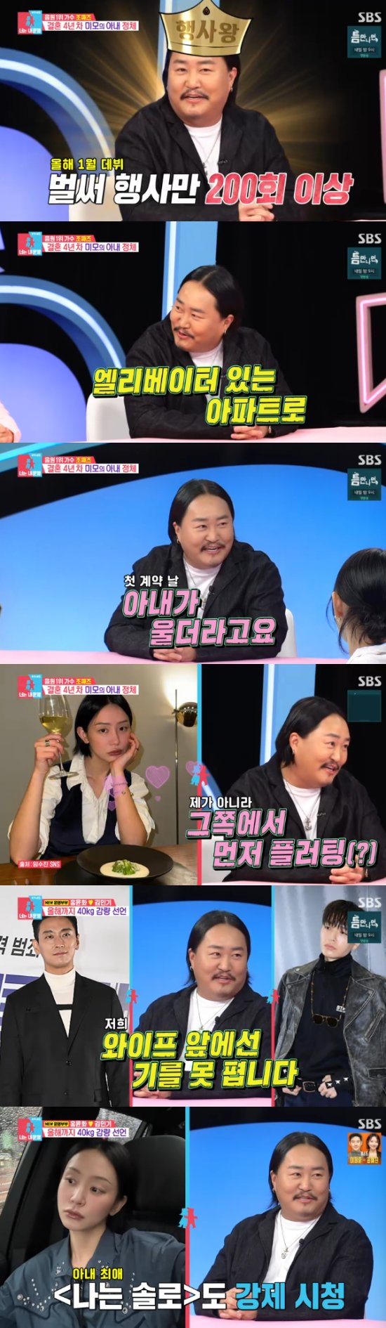 또 조째즈는 주지훈, 쌈디 등과 절친이라면서 "주 3~4회 정도는 만난다. 그런데 그 형들이 아내 앞에서는 기를 못 편다. 아내가 완전 테토녀다. 아내가 '나는 솔로'를 좋아해서 형들도 강제로 '나는 솔로'를 시청한다"고 말해 웃음을 자아냈다.
