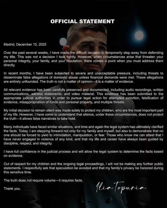 보도에 따르면, 그는 소셜미디어에 공개한 장문의 성명에서 "타이틀 방어에서 잠정적으로 물러나기로 하는 어려운 결정을 내렸다"며 "개인적 무결성, 가족, 그리고 명성을 위협하는 상황이 발생했을 때, 이를 직접 마주해야 할 시점이 있다"고 밝혔다.