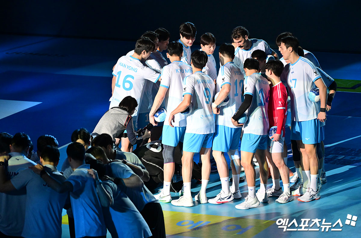 (엑스포츠뉴스 인천, 김한준 기자) 16일 오후 인천 계양체육관에서 열린 '진에어 2025-2026 V-리그' 대한항공과 현대캐피탈의 경기, 대한항공 선수들이 파이팅을 하고 있다.