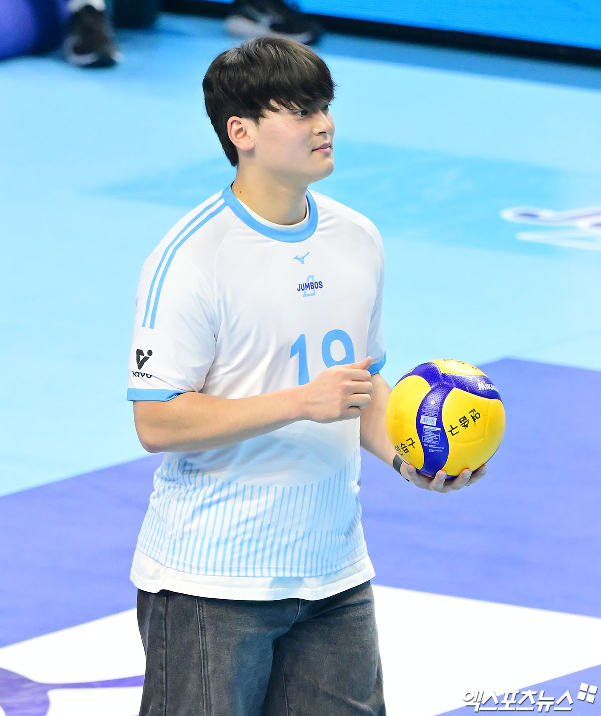 (엑스포츠뉴스 인천, 김한준 기자) 16일 오후 인천 계양체육관에서 열린 '진에어 2025-2026 V-리그' 대한항공과 현대캐피탈의 경기, 경기 전 SSG 조병현이 시투에 임하고 있다.