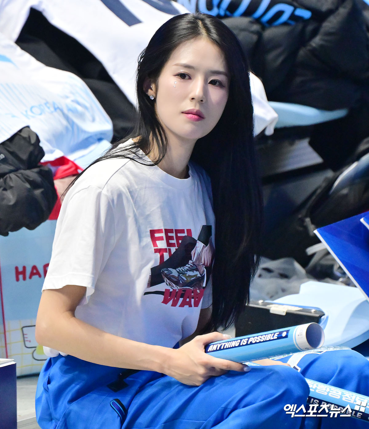 (엑스포츠뉴스 인천, 김한준 기자) 16일 오후 인천 계양체육관에서 열린 '진에어 2025-2026 V-리그' 대한항공과 현대캐피탈의 경기, 박기량 치어리더가 휴식을 취하고 있다.