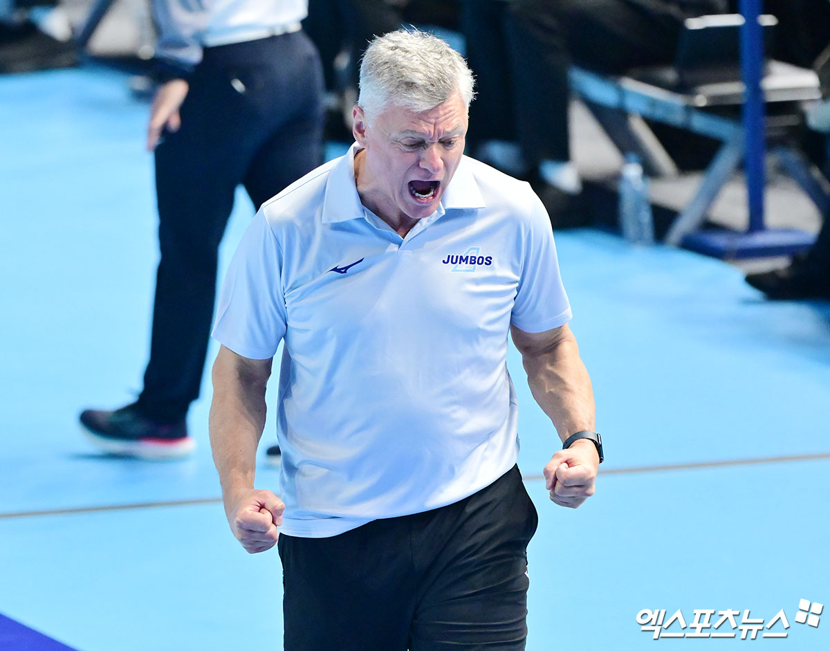(엑스포츠뉴스 인천, 김한준 기자) 16일 오후 인천 계양체육관에서 열린 '진에어 2025-2026 V-리그' 대한항공과 현대캐피탈의 경기, 대한항공 헤난 감독이 기뻐하고 있다.