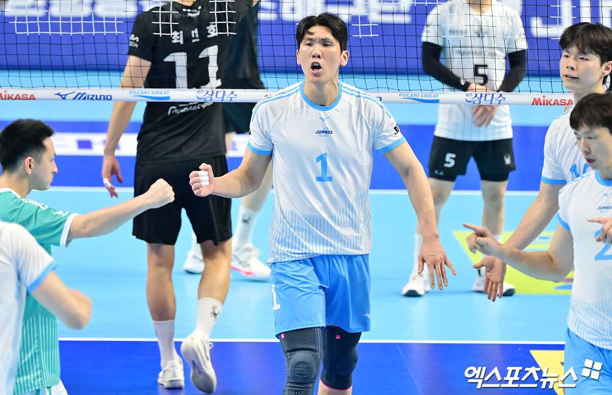 (엑스포츠뉴스 인천, 김한준 기자) 16일 오후 인천 계양체육관에서 열린 '진에어 2025-2026 V-리그' 대한항공과 현대캐피탈의 경기, 대한항공 김규민이 득점 후 기뻐하고 있다.